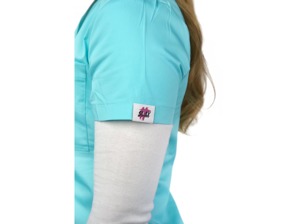 Střih haleny lichotí ženské postavě, umožňuje volnost pohybu a zároveň drží tvar i po mnoha praních. Výrazná tyrkysová barva podtrhuje svěžest celé kolekce a skvěle doplňuje bílé nebo neutrální kalhoty. Logo SLAY na rukávu je symbolem komunity mladých zdravotnic, které chtějí být profesionální, stylové a sebevědomé.