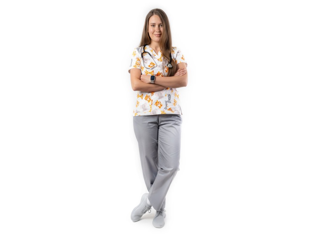 Model Gr(a)y's Anatomy pochází z české dílny rodinného krejčovství, kde se dbá na precizní zpracování, ruční kontrolu kvality a design vytvářený s láskou k řemeslu. Každý kus vzniká s ohledem na skutečné potřeby zdravotnic – proto mají kalhoty čtyři praktické kapsy, které umožňují mít potřebné pomůcky či drobnosti vždy po ruce.