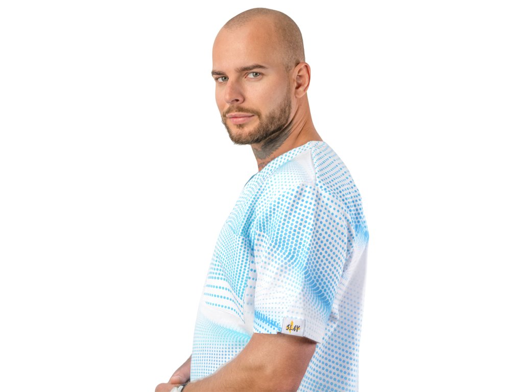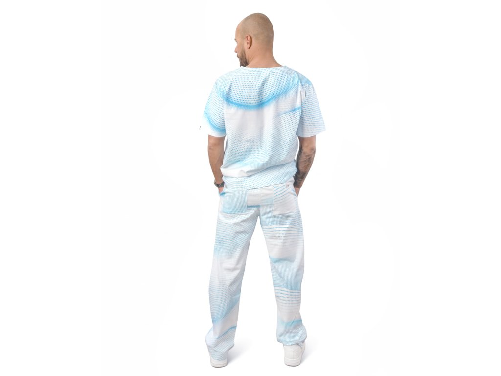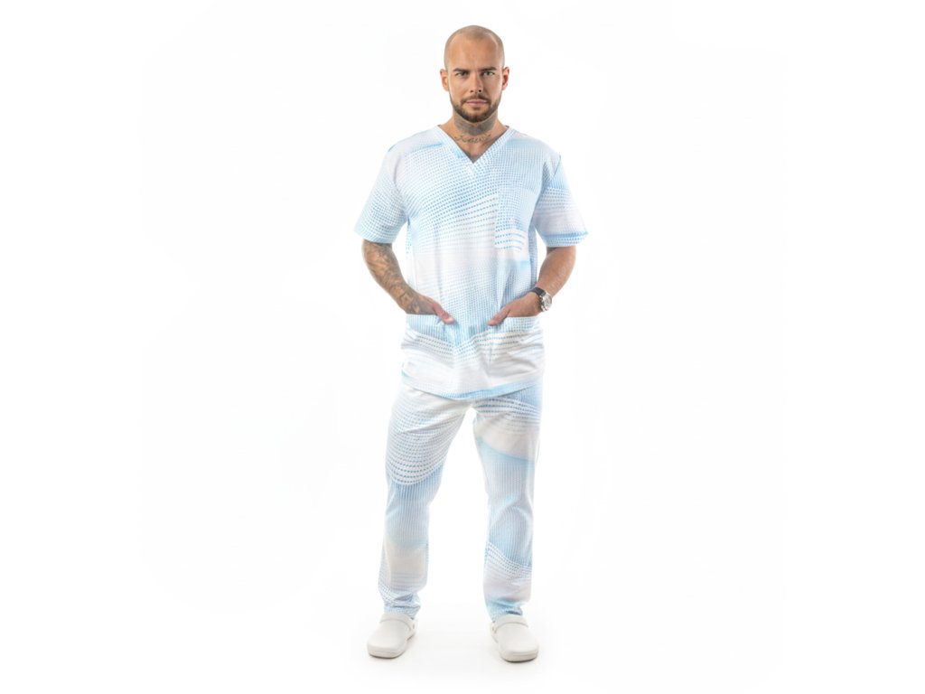 Celoplošný potisk v odstínech oceánské modři s jemným 3D efektem vytváří dojem pohybu, svěžesti a luxusu. Halena je ideální volbou pro lékaře, zdravotníky a profesionály, kteří chtějí vypadat reprezentativně a zároveň se cítit skvěle i během náročných směn.